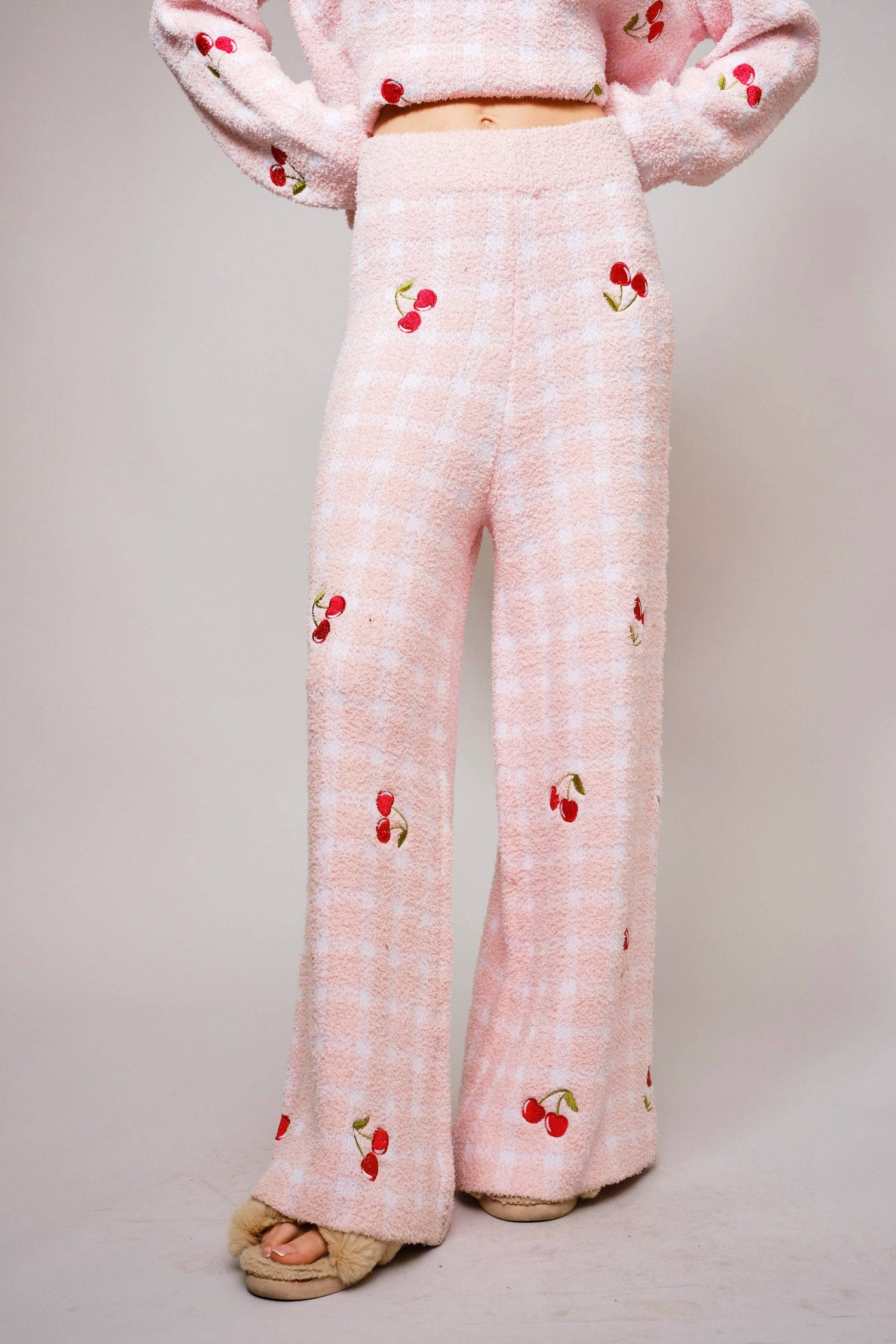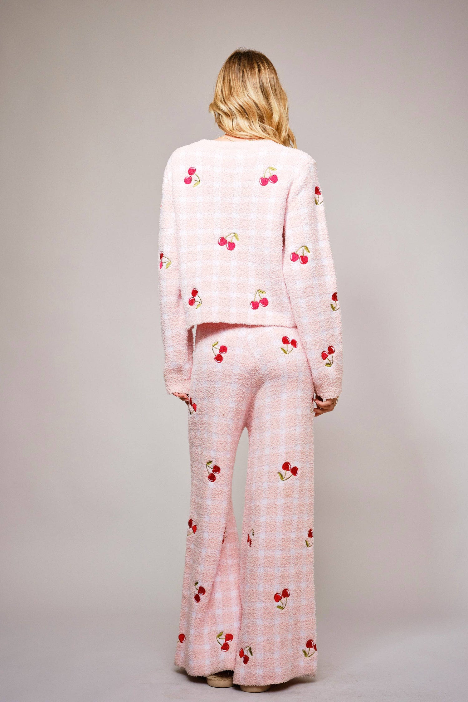 Fuzzy pink plaid sweater set embroidered with playful cherry motifs. Perfect for lounging in style.