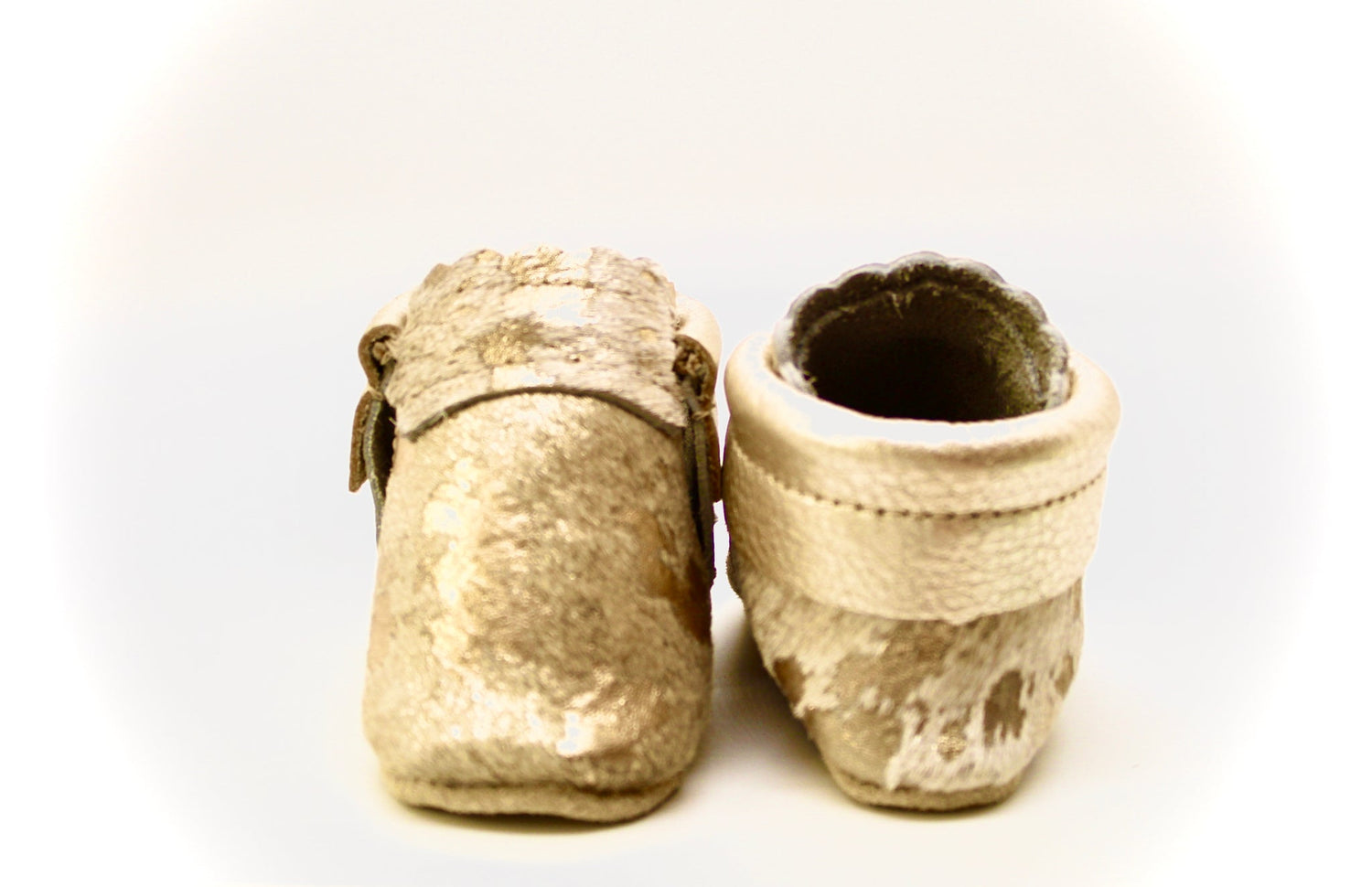 This pair of moccasin is limited Edition and is designed with your little one in mind. This is a beautiful and unique acid wash leather with gorgeous gold shimmer. As with all of our moccs, we added an elastic band around the ankle to keep them on their adorable little active feet. Soles Oon our moccs are made from high grade suede, to provide a non-slip wear for the busy kiddos. MishMoccs are suitable for newborns, infants and toddlers. A great look and great comfort are guaranteed with your purchase of any of our moccs!