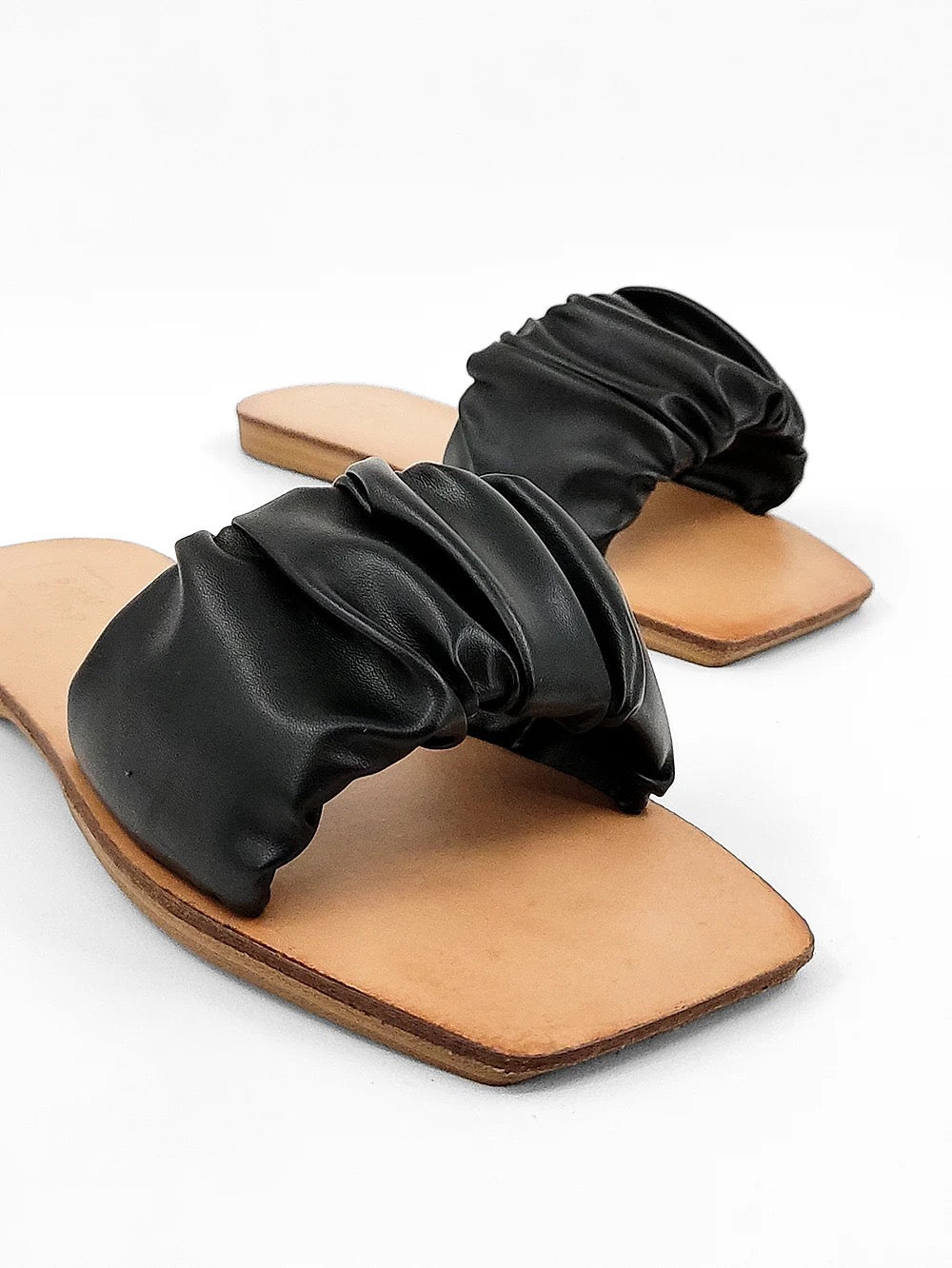 Get pedi-season-ready in our BELINDA slip-on sandals. These are made from smooth faux leather ruched straps and finished with a squared toe.