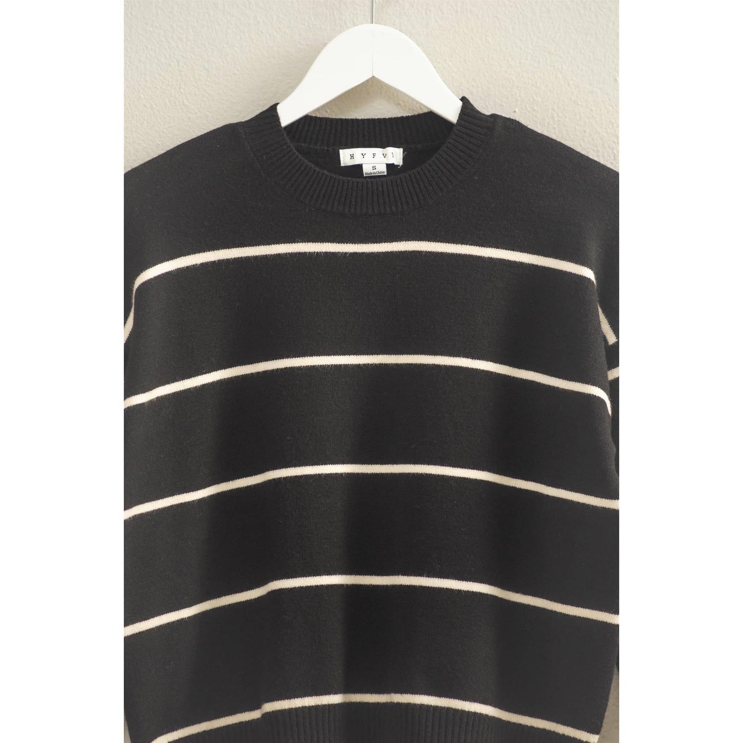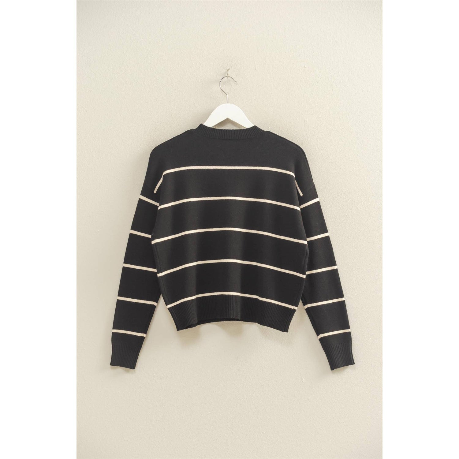 Embrace effortless style with this timeless striped sweater, featuring a classic crew neck and long sleeves. Its structured silhouette ensures a flattering fit, making it a versatile choice for a variety of occasions. Ideal for layering, style it over a collared shirt or under a sleek jacket for those chilly evenings. 50% rayon 28% polyester 22% nylon Model Is 5' 6" Tall, 32" Chest, 24" Waist, 32" Hips And Wearing A Size Small Imported. Designed In The USA