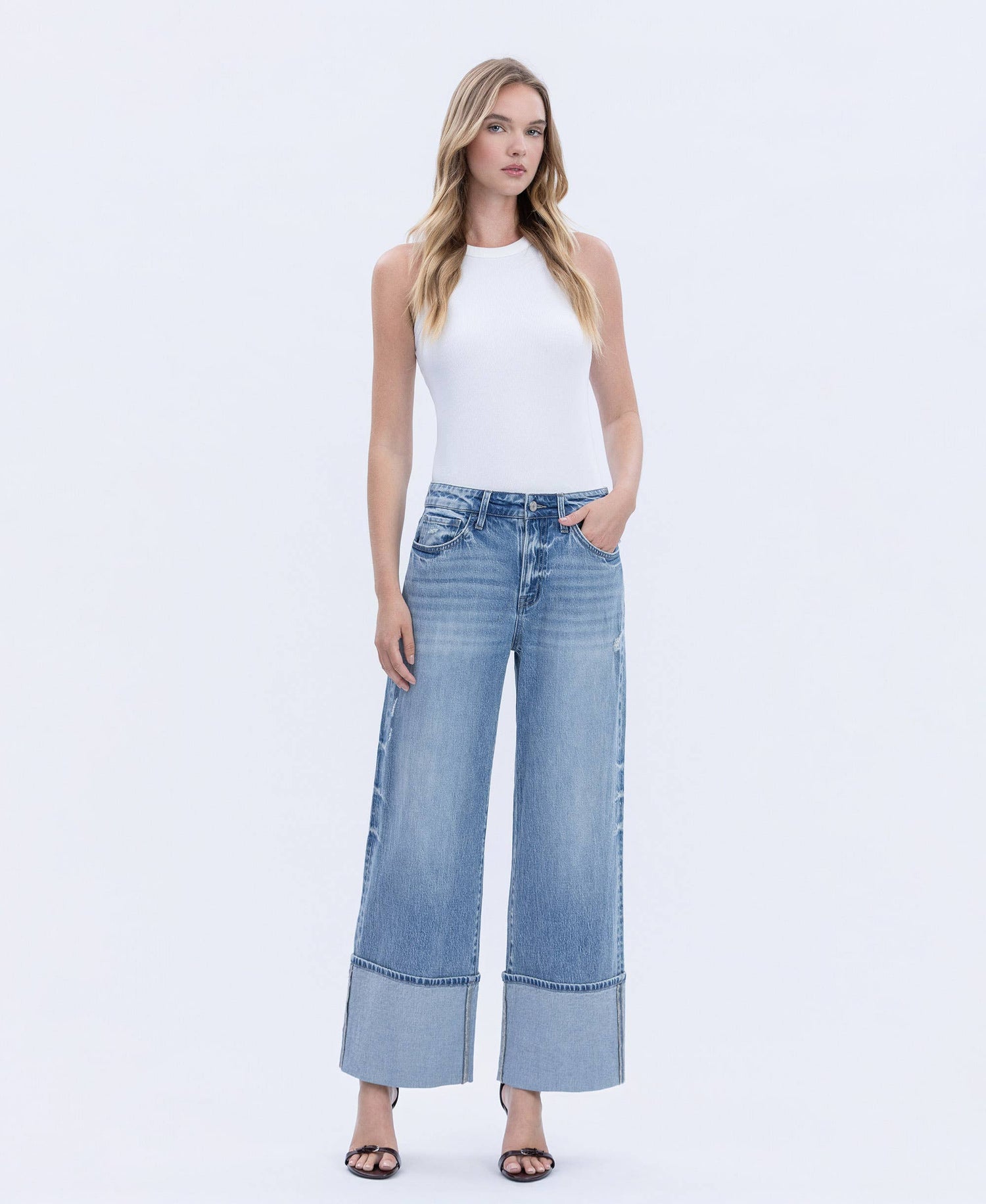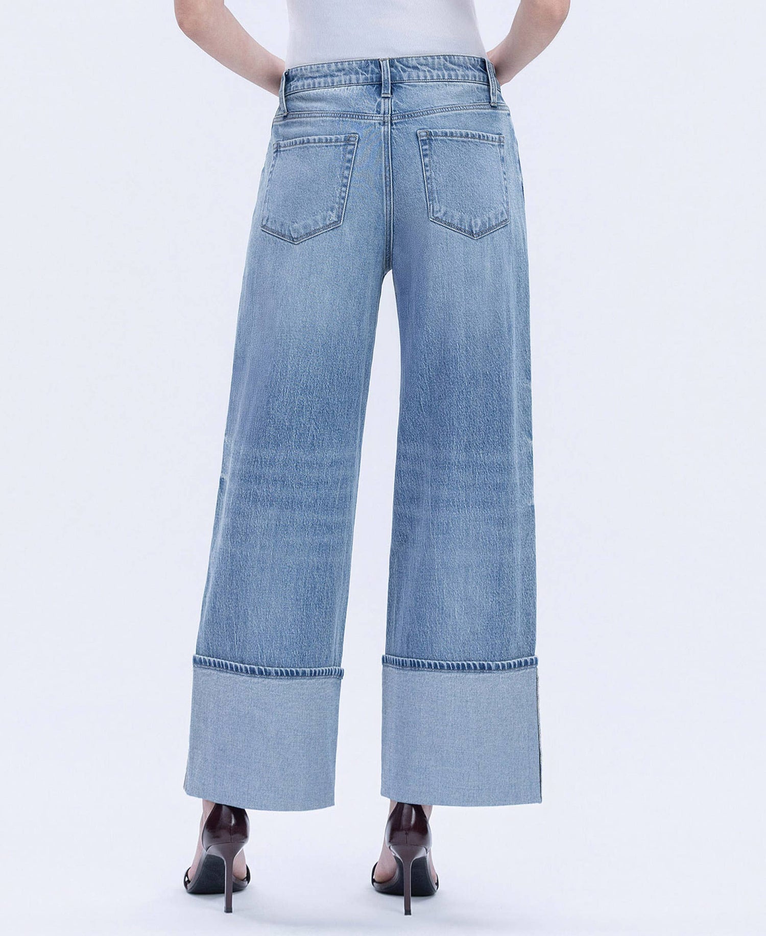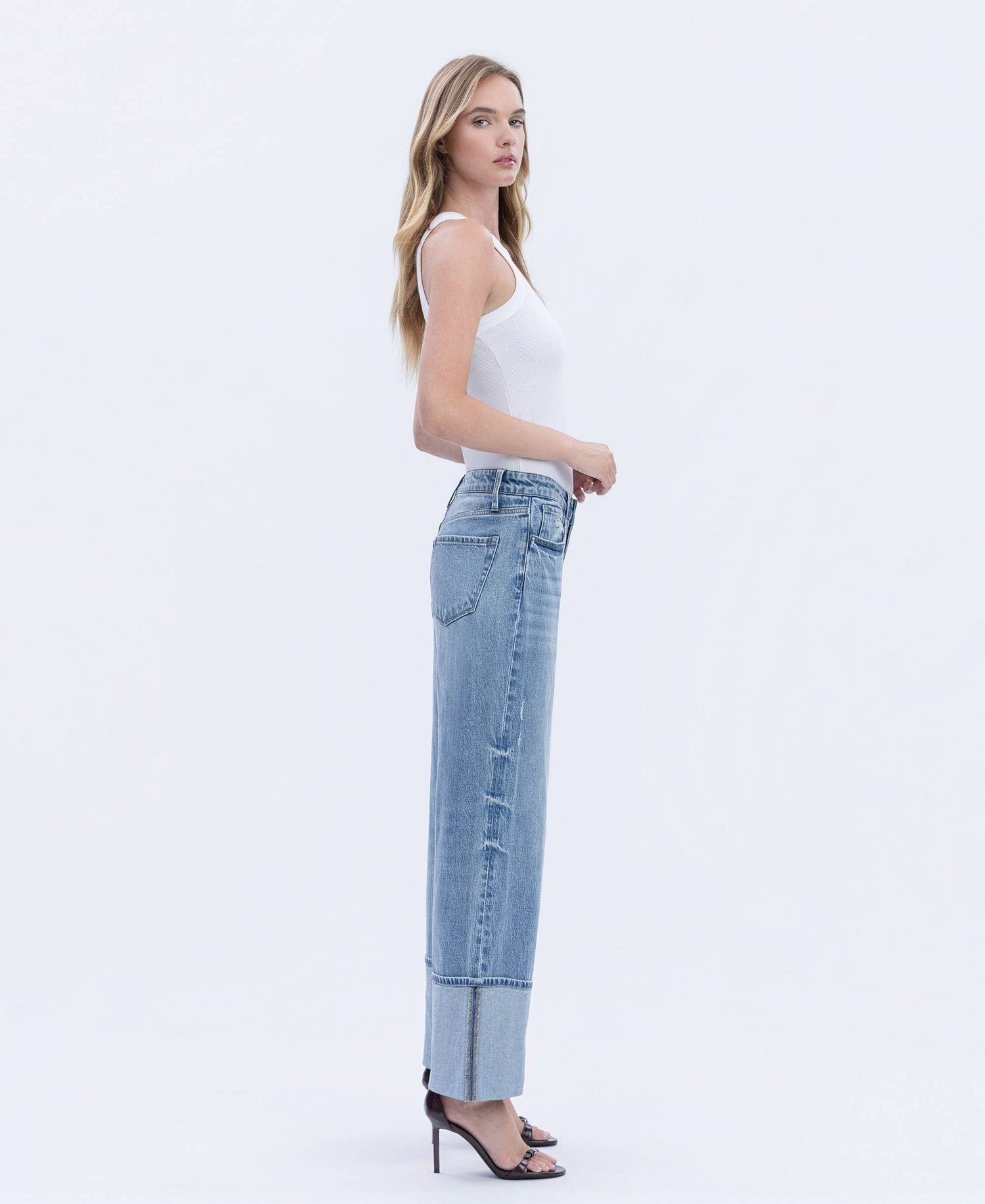 COMFORT STRETCH DENIM, HIGH RISE WAIST, LIGHTLY DISTRESSED DETAIL, SINGLE CUFF HEM, ANKLE LENGTH, WIDE LEG JEANS