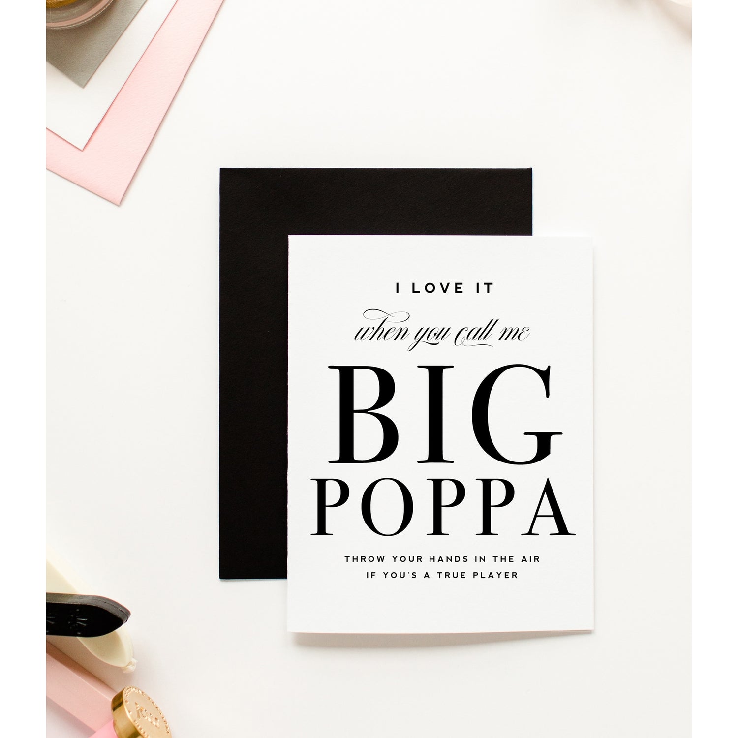 Introducing Kitty Meow's Love it when you call me big poppa, father's day greeting card for notorious B.I.G. fans. I love you it when you call me big poppa. Throw your hands in the air if you’re a true playa. Each witty 4.25" x 5.5" folded greeting card is printed on bright white, thick card stock and comes with a black A2 envelope. Blank inside.