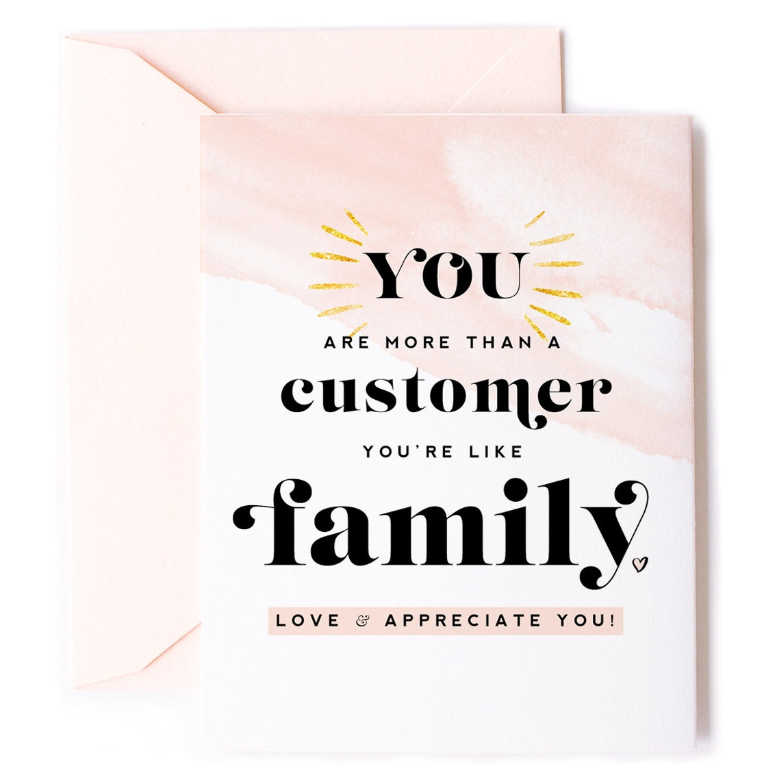 Introducing Kitty Meow's "More Than a Customer - Like Family" - Sweet Client Appreciation Card for your favorite customer and client. Talk about customer service when you send this card! Each Sweet, 4.25" x 5.5" folded greeting card is printed on bright white, thick card stock and comes with a blush A2 envelope. "You're more than a customer - you're like family." Blank inside.