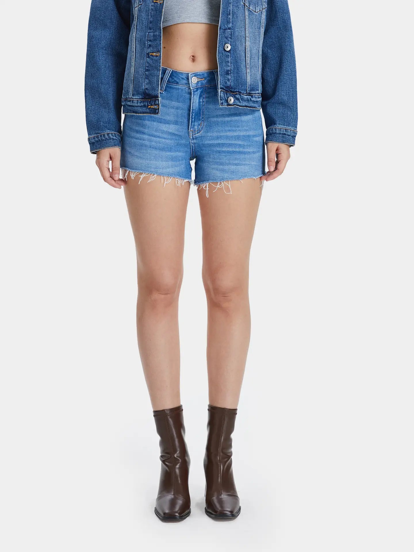 Crafted from comfort stretch denim Anita blue(medium blue) Five pockets, mid rise waist, zipper fly, natural washing effect, whisker effect, raw hem, denim shorts Care instruction:machine wash S:waist 27 1/4'' / front rise 9 1/4'' / inseam 3''