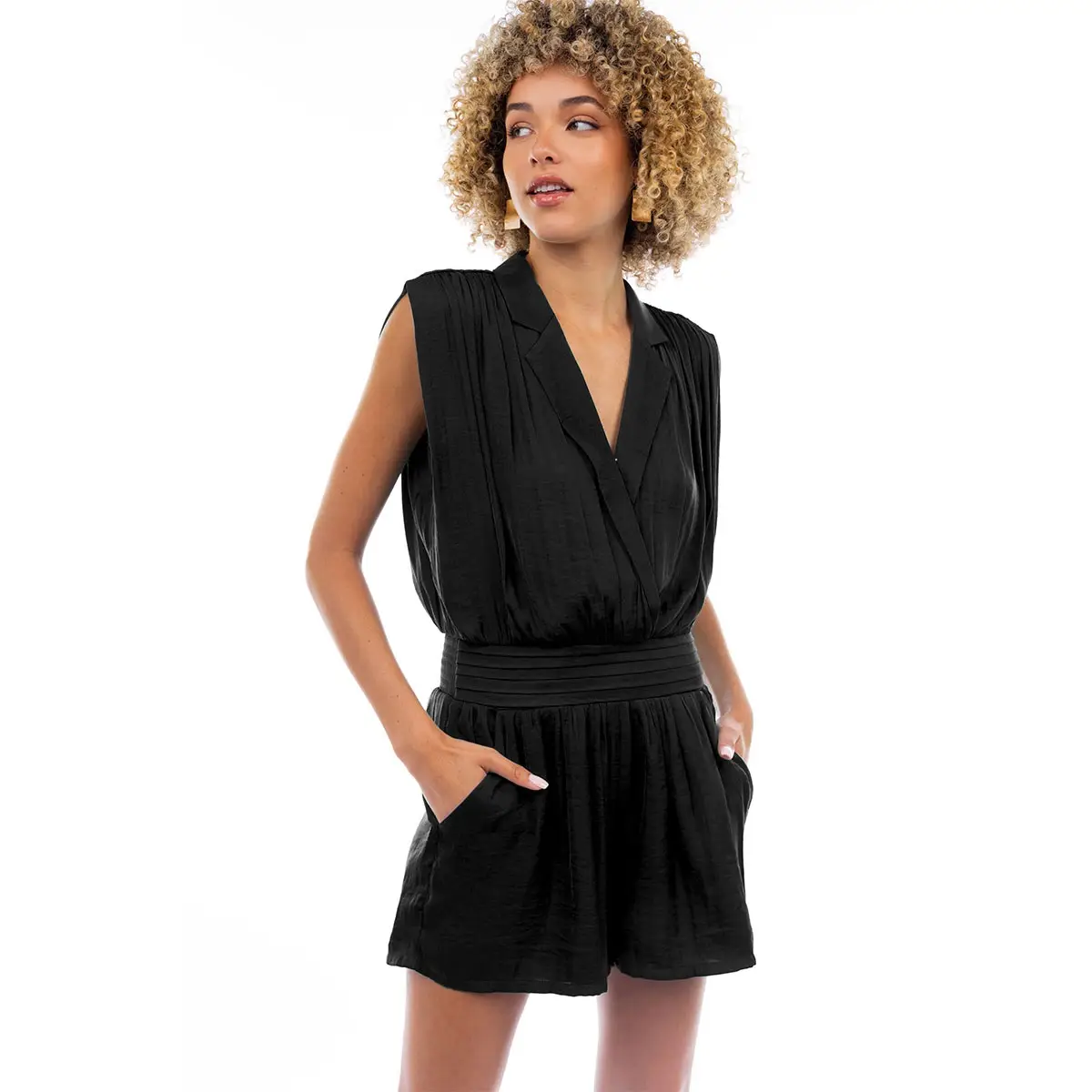 Notched Collar Romper With Pleated Waistband Detail Our Notched Collar Romper features a sophisticated design highlighted by a pleated waistband detail. Perfect for effortless elegance, this romper combines a notched collar with a flattering silhouette, making it an ideal choice for both casual outings and dressier occasions. Fabric: Woven 100% Polyester Hand Wash Cold