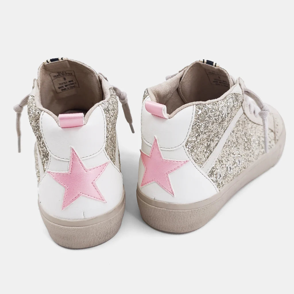 The Riley mid-top sneakers are a perfect blend of contemporary and classic design. These sneakers feature a unique combination of colors and textures that give them a modern touch. The high-quality glittery faux leather material used in crafting the sneakers ensures durability and comfort. The suede texture panels with pink metallic faux leather accents on the back give them an elevated feel. A versatile pair that can be paired with various outfits to create a stylish and complete look.