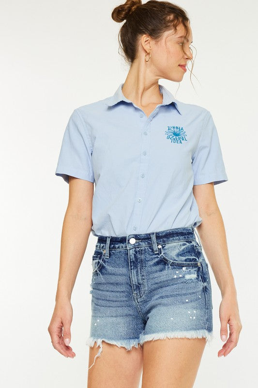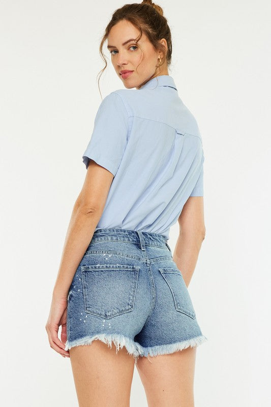 HIGH RISE DENIM SHORTS MEDIUM WASH STRETCH FRAYED HEM PAINT SPLATTER 5 POCKET STYLE FRONT RISE 11" INSEAM 3" WAISTBAND: 1.5" IN SIZE M 99% COTTON, 1% SPANDEX
