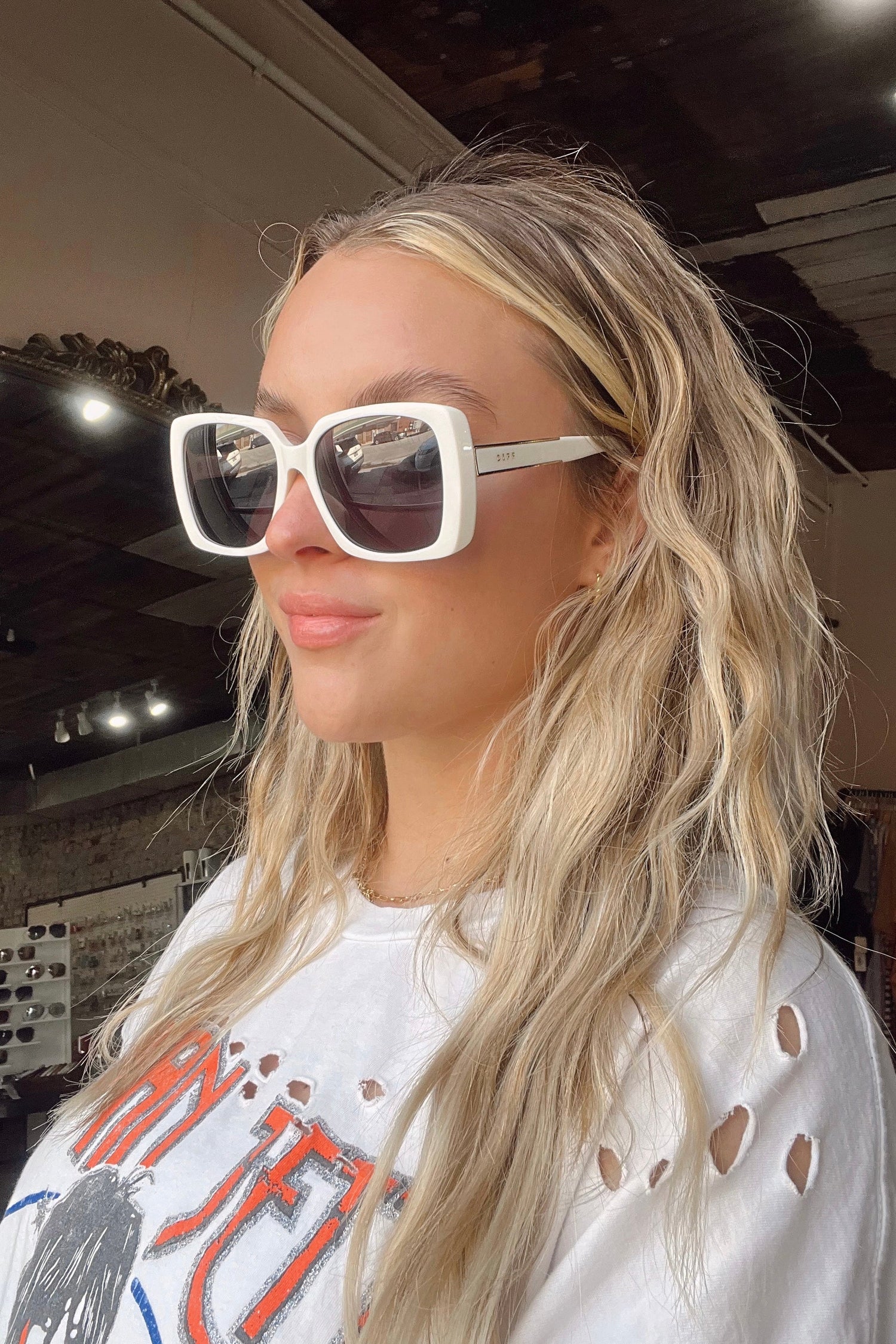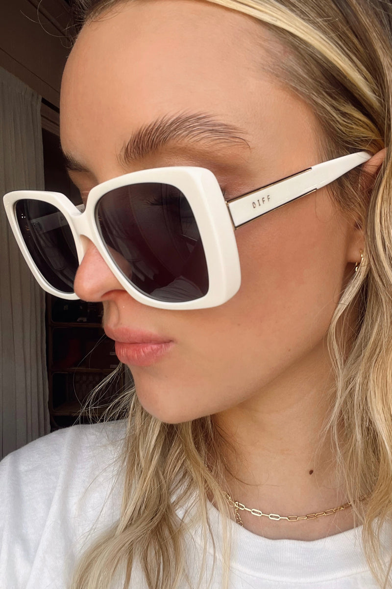 "You'll be beamin' in Sophie when you grab these ivory frames and grey lenses. Whether your style is classic or cutting-edge, Sophie Sunglasses will keep you looking fly all day long!"