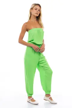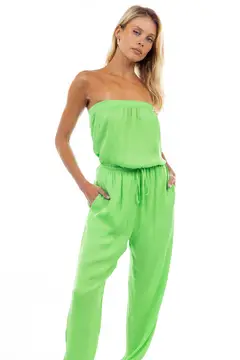 The details: - Women's Strapless Tie Waist Jogger Jumpsuit. - Soft fabric with a strapless design for a chic, modern look. - Tie waist for an adjustable, flattering fit. - Jogger-style bottom for a relaxed, comfortable silhouette, perfect for casual outings or relaxed evenings. Fabric: Woven 100% Polyester Hand Wash Cold