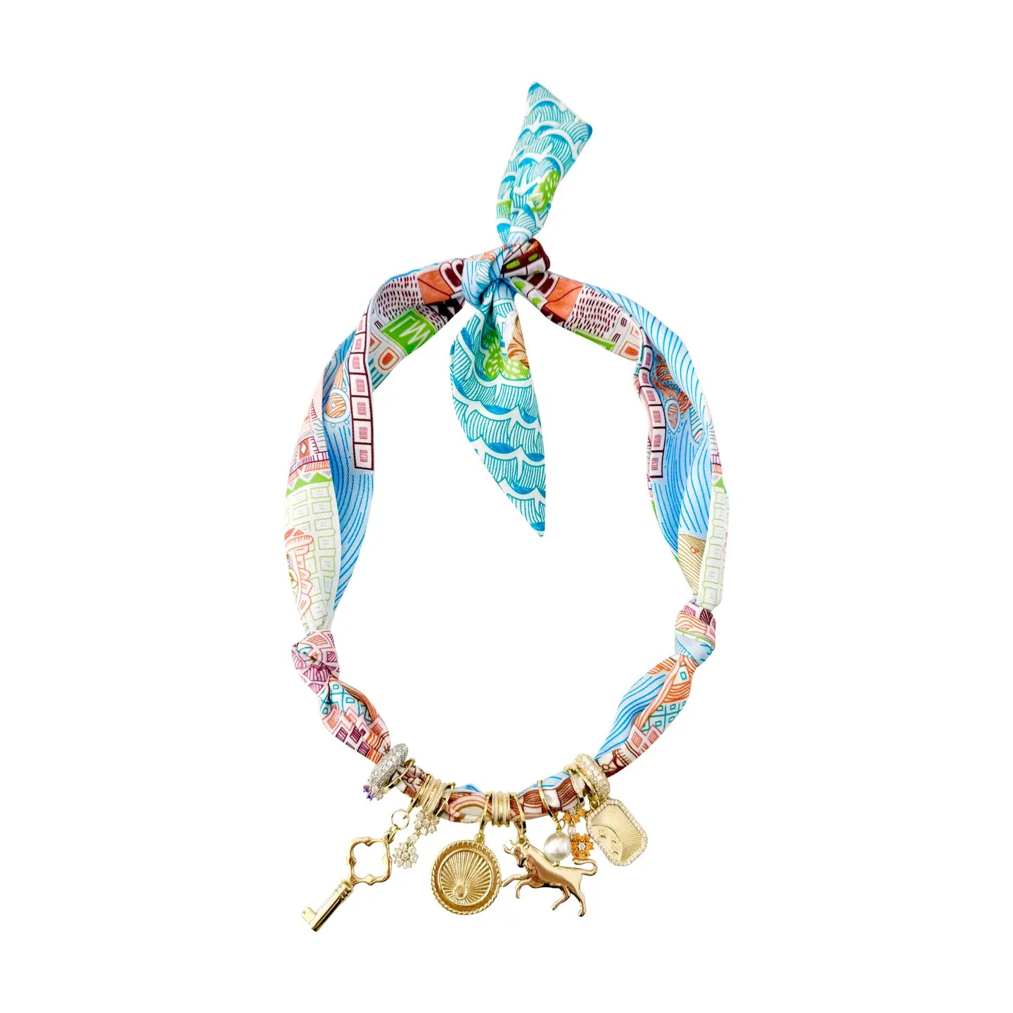 Our Best seller, the Tate Multi Charm Scarf Necklace is a bold and eclectic statement piece. This scarf necklace features eight beautifully detailed charms, including a purple flower, key, double flower, coin charm, bull charm, pearl, orange flower, and CZ star charm. Designed in Dallas, TX by Claire Morgan, this unique accessory is perfect for layering or wearing solo, adding a stylish and meaningful touch to any outfit.